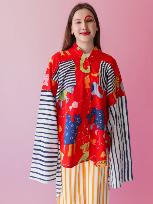 100% upcycled fabric – once a bedsheet, tablecloth, curtains, or scraps. Now a damn good shirt.