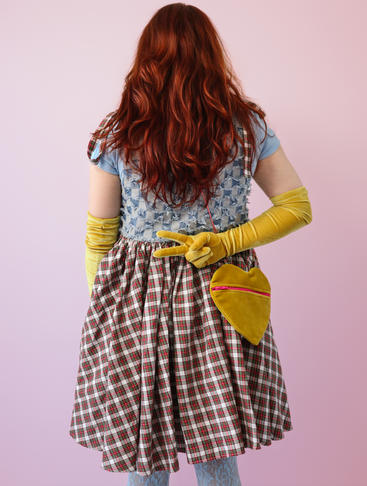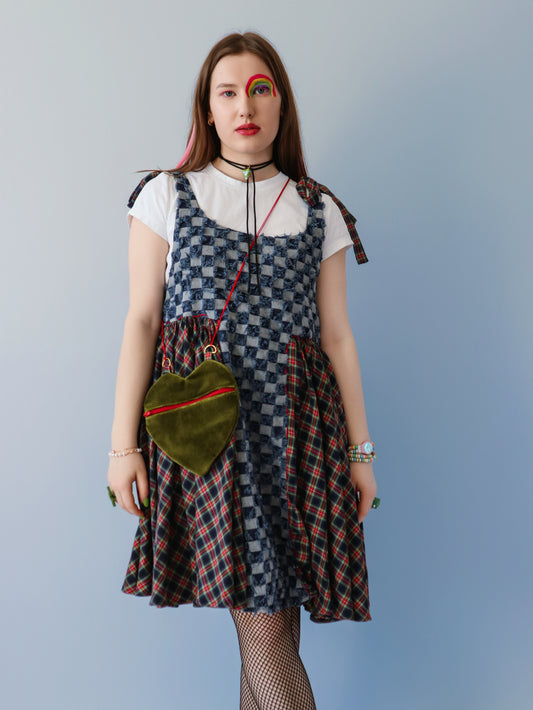 This dress doesn’t ask for attention — it demands it. Plaid, denim, and a whole lot of attitude. Perfect for anyone who’s too badass for the basics. Sorry, it has no pockets, but that's where the heart-shaped pouch comes in. Carry your essentials with a little extra love. Made to order...