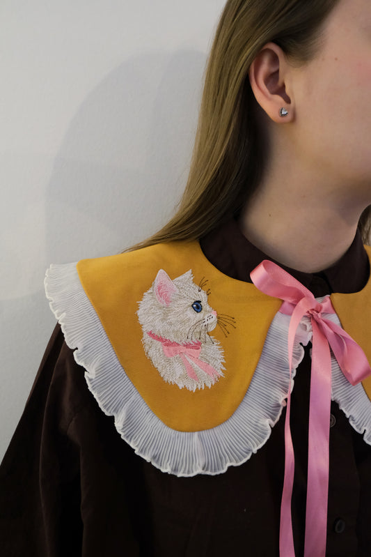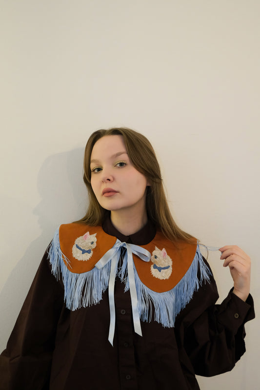 Gentleman Detachable Collar is a handmade statement accessory featuring a refined cat motif. Designed to elevate shirts, dresses, and knits, it adds character, charm, and a quietly playful elegance to everyday looks. Made to order – ships in 1 to 3 weeks. We work with new, upcycled, recycled, and repurposed...