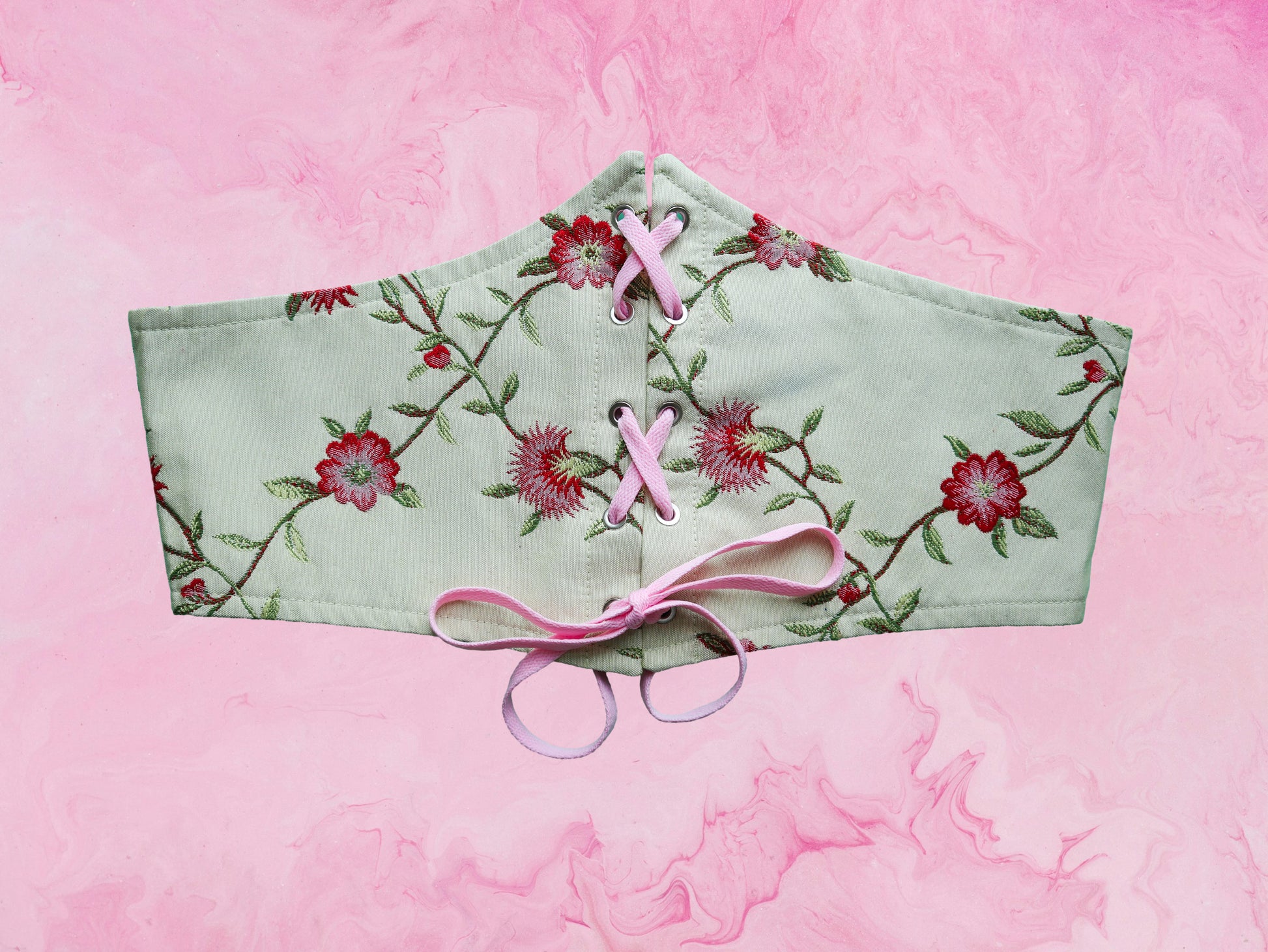 100% upcycled fabric – once a bedsheet, tablecloth, curtains, or scraps. Now a damn good corset.